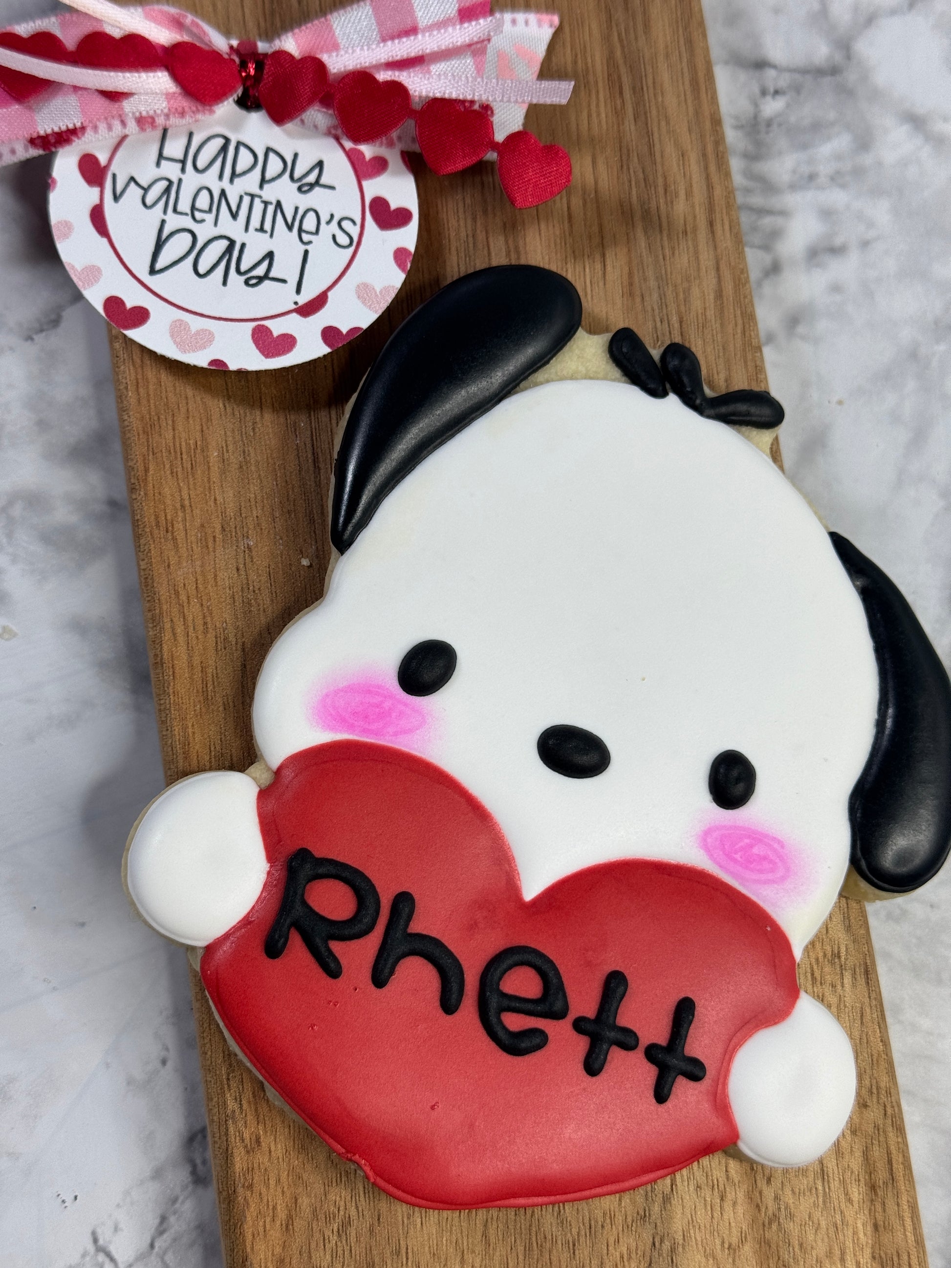 This adorable puppy/dog cookie holding a heart is almost as cute as the real thing! The heart can be customized for a name or special message. This LARGE cookie can be purchased in a clear gift box with a tag and bow, or a bag with a tag and a bow. This cookie gift is all ready to make someone smile!
